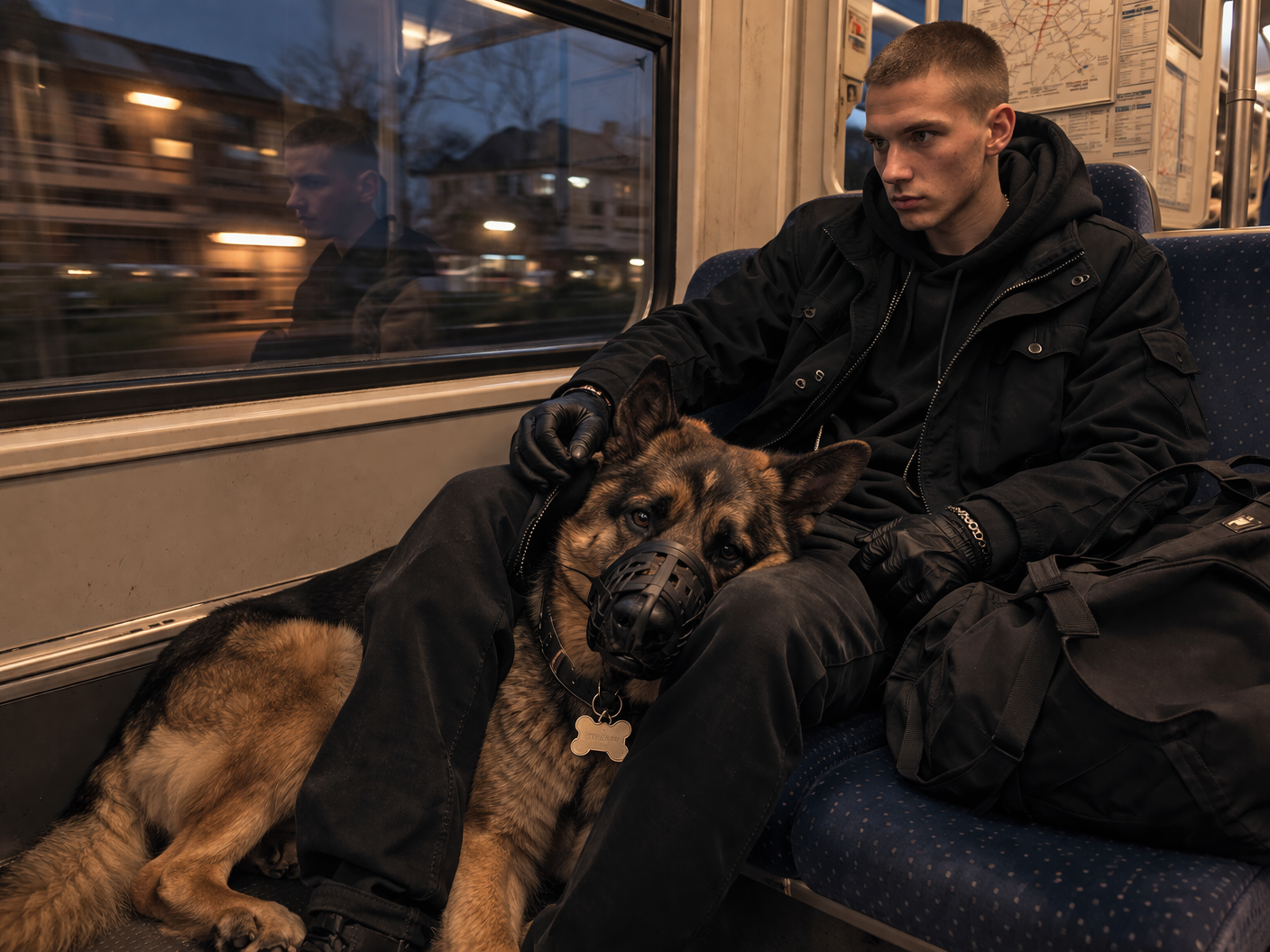 Il n’a d’yeux que pour lui. 20 ans, cheveux ras, manteau noir, sac noir, gants noirs. Un regard perçant, une voix autoritaire, une main ferme. Lui gémit, regarde les passagers qui, c’est selon, manifestent de la surprise, de la peur, de l’attendrissement. Il s’allonge, se redresse, pose sa tête dans les mains de son maître. Sa médaille en forme d’os pend à son cou, juste sous la muselière qu’il supporte difficilement. Il me regarde, puis semble demander à son maître l’autorisation de s’approcher de moi. « Atlan… ». La voix de son maître est sans espoir, ses yeux me quittent. Il me rappelle mon berger, compagnon de jeunesse. Mes amis le surnommaient « Hannibal le cannibale », mais il n’avait jamais mangé personne. Les deux se seraient bien entendus.