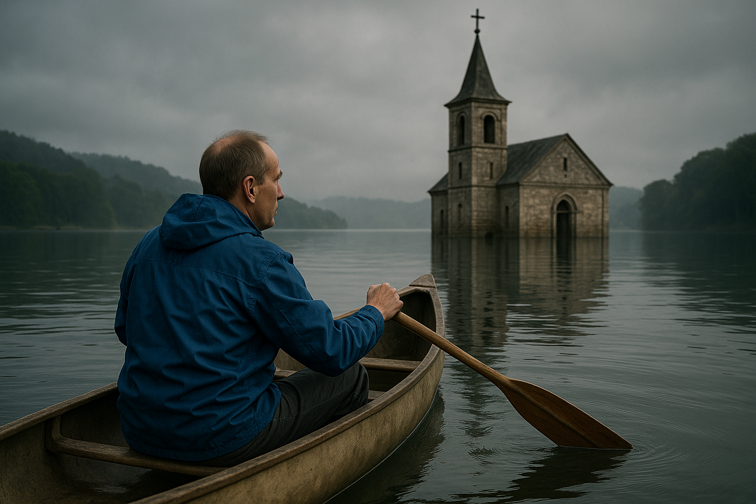 Armand remonta dans sa barque et prit le chemin du retour. Assez abasourdi de cette rencontre. Il rama une dizaine de minutes pour regagner la terre ferme. La brume était tombée sur le lac, apportant une touche automnale au décor surréaliste qu’il avait sous les yeux. Une église qui dépassait encore de la surface de l’eau, pour combien de temps encore. Il entendait la mélodie de Debussy, lorsqu’en modulant en si majeur, le compositeur faisait émerger la cathédrale de l’eau. Se découpaient encore, ombres massives, la chapelle néo-gothique au nord du chœur et le portail occidental du 12e siècle entièrement restauré après-guerre, exception faite des chapiteaux recevant les voussures. C’était à pleurer. Armand avait tellement de souvenirs liés à cette église… Lorsqu’ils allaient en famille assister à la messe dominicale, ses premières messes en enfant de chœur, ses cours de catéchisme avec l’abbé, sa première communion, puis sa profession de foi. Et bien entendu sa rencontre avec l’orgue. Une page se tournait, violemment.